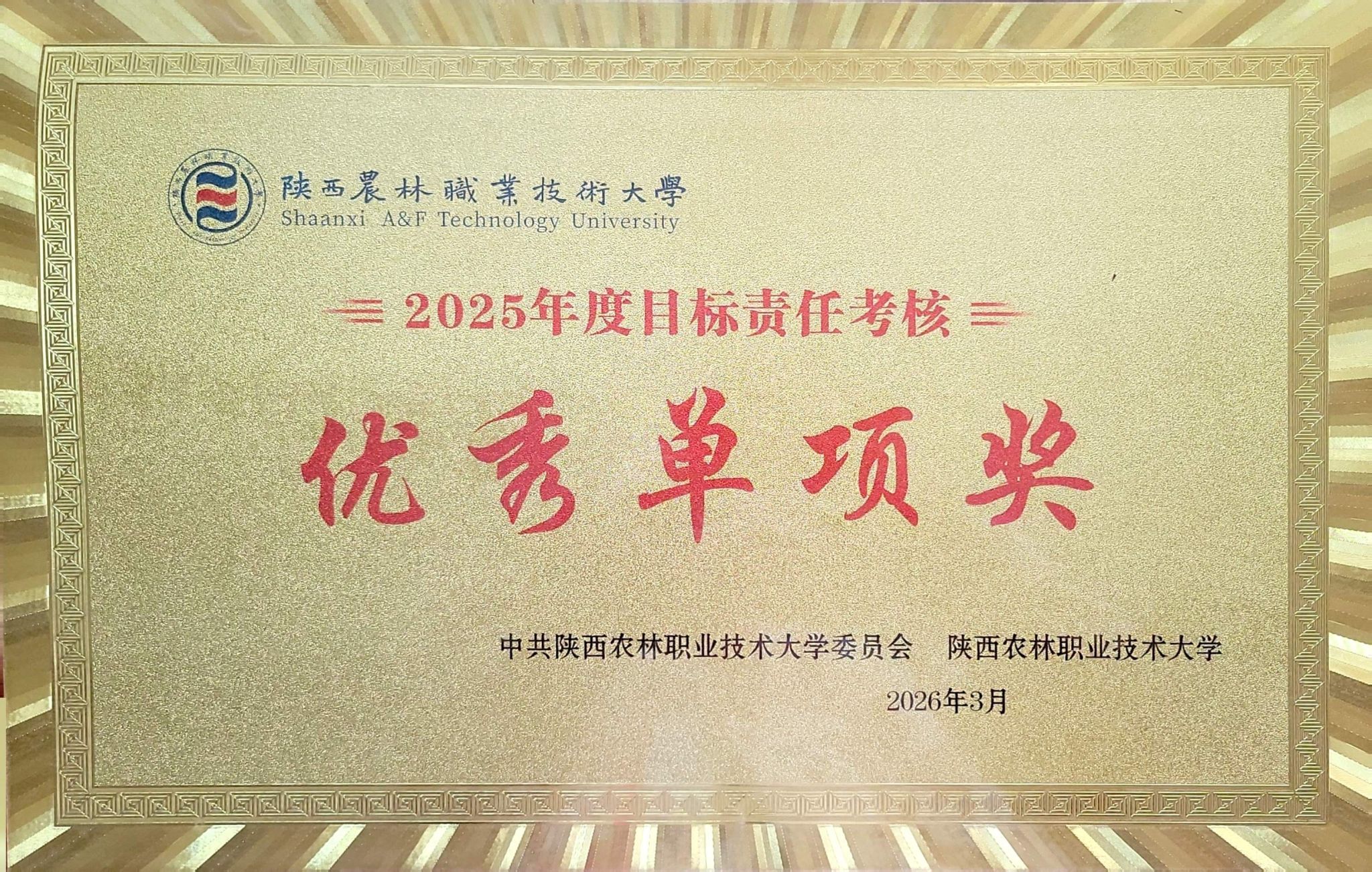 春启新程,喜报频传。3月6日下午,学校2026年开学工作会暨全面从严治党工作会召开,我院凭创新精神和学科业绩获“2025年度优秀单项奖”,这一荣誉是学校对学院工作的肯定,也是全院师生凝心聚力、勇攀高峰的写照。