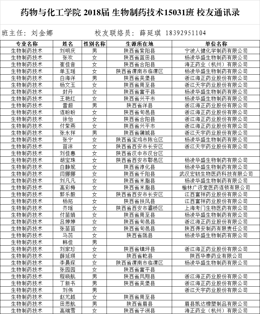 2018届生物制药技术15031班校友通讯录