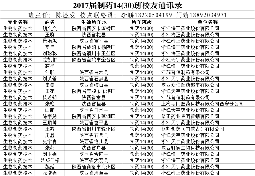 2017届制药14(30)班校友通讯录