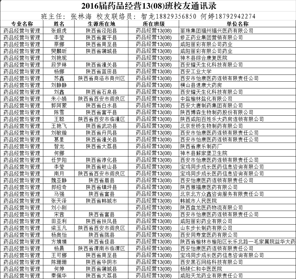 2016届药品经营13(08)班校友通讯录