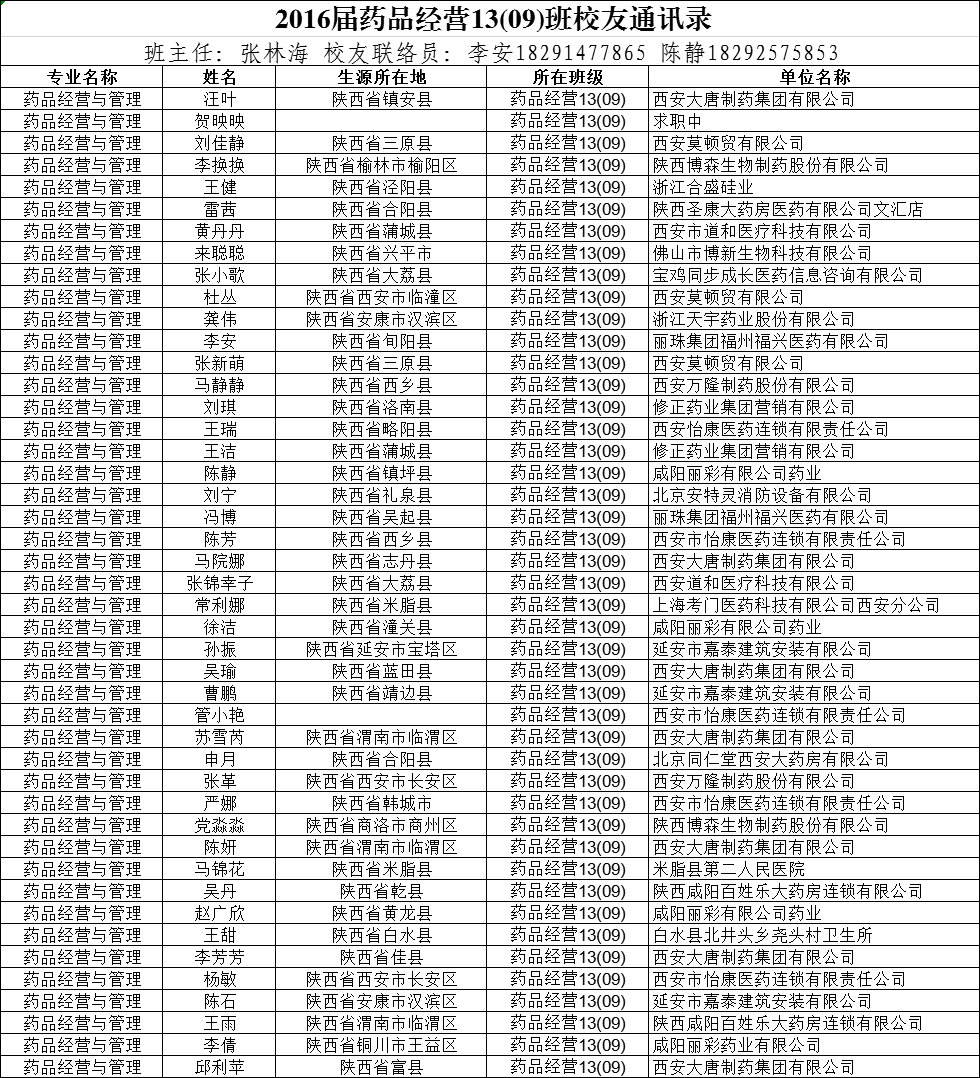2016届药品经营13(09)班校友通讯录