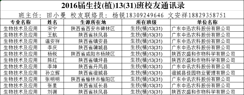 2016届生技(植)13(31)班校友通讯录