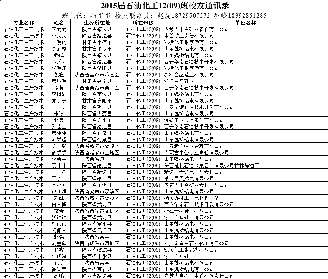 2015届石油化工12(09)班校友通讯录
