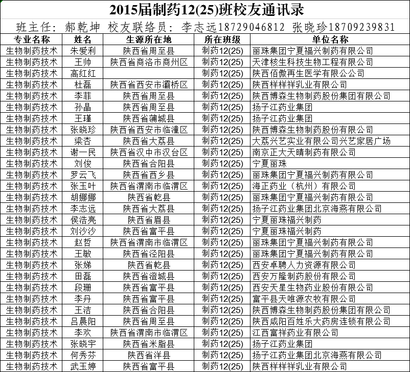 2015届制药12(25)班校友通讯录